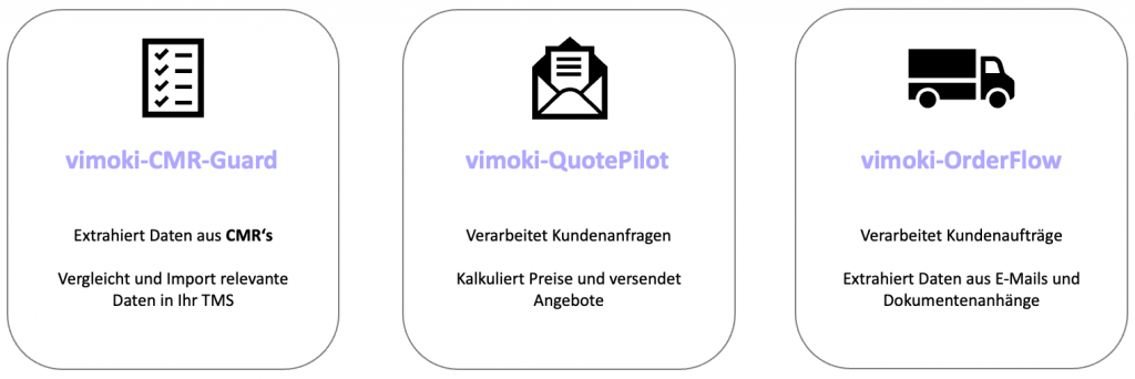 Unsere drei individuell auf Ihre Prozesse angepassten KI-Assistenten unterstützen Sie dabei, zeitintensive Routineaufgaben zu Automatisierung. Mit dem Ziel Ihre gesamte Kunden- und Auftragskommunikation effizienter zu gestalten.